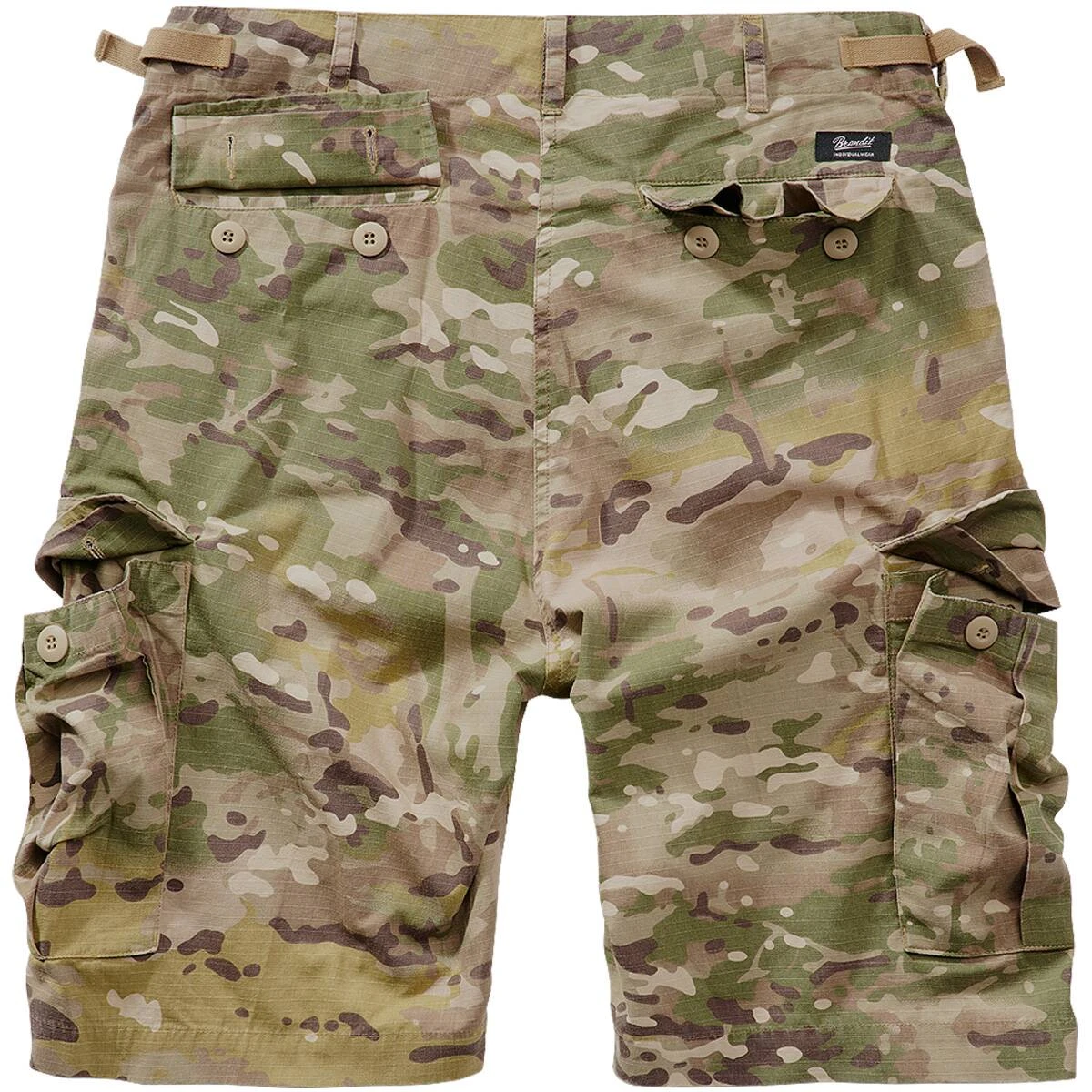 Die beliebte BDU Ripstop Shorts von Brandit ist der ideale Begleiter durch den Sommer. Sie ist bequem geschnitten und besteht zu 100% aus Baumwolle, was ein angenehmes Tragegefühl verspricht. Dank der 2 seitlichen Einschubtaschen, der 2 geknöpften Gesäß-Pattentaschen sowie der 2 seitlich aufgesetzten geknöpften Bein-Cargotaschen ist die Shorts auch sehr praktisch und bietet viel Stauraum. Die Bermuda wird mit einer Knopfleiste geschlossen. Sie besitzt an den Seiten Verstellbänder, mir denen die Taillenweite bequem reguliert werden kann und breite Gürtelschlaufen (ca. 4,5 cm). Aufgrund des Ripstop-Gewebes ist die Shorts besonders robust: alle paar Millimeter zieht sich ein kräftigerer Kett- bzw. Schussfaden durchs Gewebe. Sollte das Material reißen, läuft der Riss nicht ungebremst durch die gesamte Fläche, sondern stoppt am stärkeren (Rip Stop) Faden! Spart also Gewicht und bietet trotzdem Stabilität.